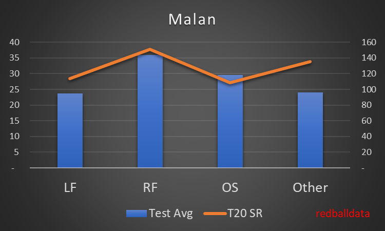 - Off Spin: We know that as a left hander, facing offspin will be relatively challenging. After five dismissals Malan has done OK. But his T20 stats (SR 108) say it’s a relative weakness.