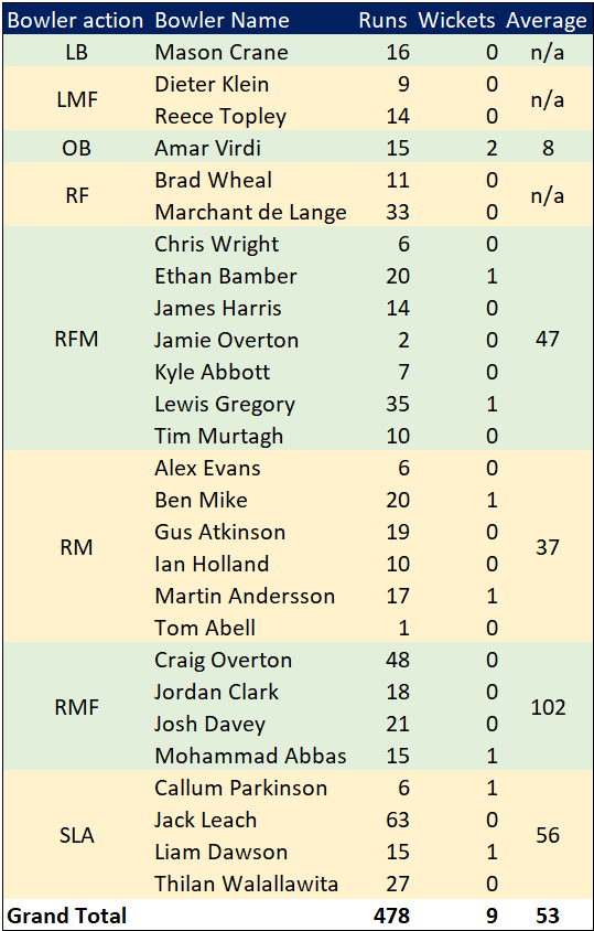 Context 1: batting in the top three. When cricket was a summer sport, it would be odd to pick a batsman averaging under 40. But top order batting in England in the spring and autumn is hard. Comparing Bracey to a selection of his peers (five number three batsmen in D2) from 2017-19, they averaged 30 and he outperformed them by 21%. Looking at this season, the top three clearly get the worst of the conditions. We should adjust expectations accordingly.