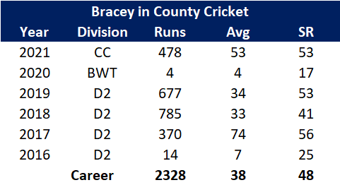 James Bracey in County Cricket. Note that prior to 2021, the 2017 performances look like the outliers, including the 156 against Glamorgan which was shoring up his average.