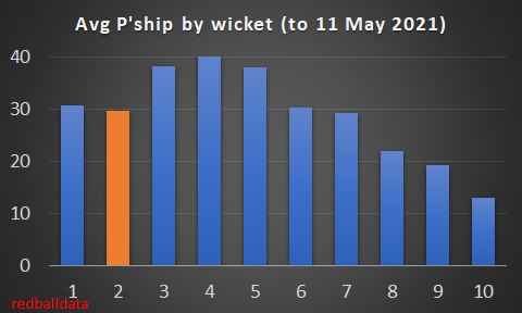Actually, Bracey has started 2021 brightly, with 478 runs in five games. That’s enough to boost his expected* Test average to 29 (+/-7)**. Here’s his record: