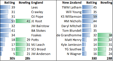 - Have an actual allrounder (Colin de Grandhomme). Contrast this with England who will probably gamble on Root to be fifth bowler. England may need to discount Stokes’ bowling (four wickets at 57 this summer, 11 at 43 in the last year of Tests). With Leach/Root as two of the five bowlers, England would have to field last if they won the toss, even if that’s not optimal. New Zealand can be more flexible.