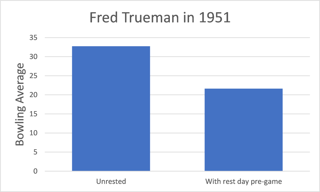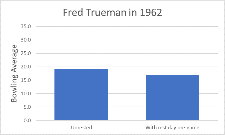 Fred Trueman bowled 802 overs in the 1962 County Championship. Was he aware he averaged 15% more when one game started the day after the previous one? Rising to 23% if you just look at the County games.
