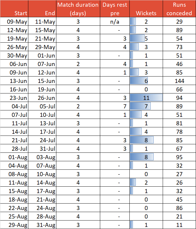 And if that’s true, then fair enough – either 1) my hypothesis is wrong (that elite pace bowlers can’t play four-days-on-three-days-off without a decline in performance) or 2) the old days were easier, meaning players could trundle all season long with no drop in performance.*